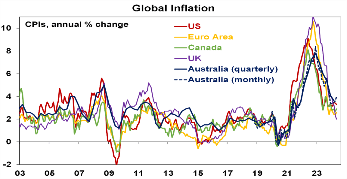 - A further fall in inflation globally. While there have been a few scares along the way, notably into last October and earlier this year, the broad trend in inflation has remained down. This reflects improved goods supply, some lower commodity prices, lower transport costs, easing demand and cooling jobs markets.