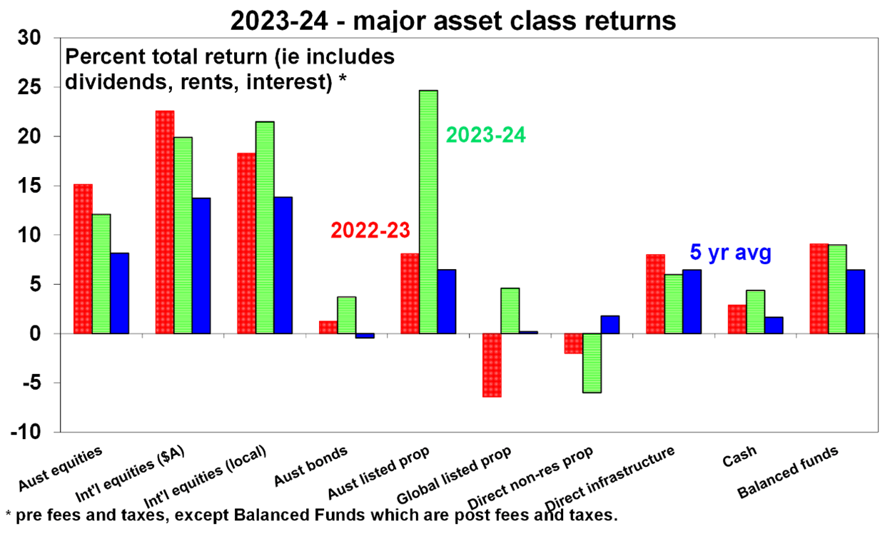 - Global shares returned 21% in local currency terms over 2023-24, with a slight rise in the Australian dollar cutting this to a still strong 20% in Australian dollar terms. Japanese and US shares outperformed with the US continuing to benefit from the AI boost. Chinese shares fell again.