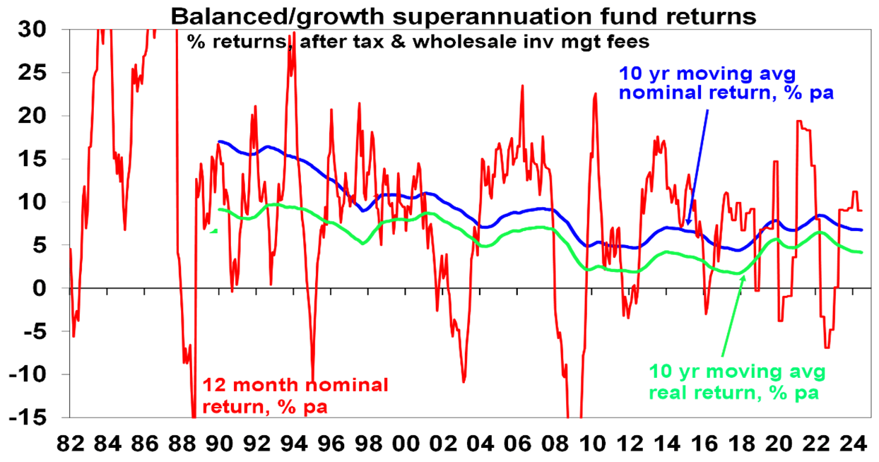 The last few years has seen a zig zag pattern in returns with average super funds seeing losses in 2019-20, very strong returns in 2020-21, a loss in 2021-22 (as inflation and bond yields surged) and have now had two years of strong returns. Given the volatility it’s best to focus on their longer-term average returns which has been 6.8% p.a. over the last decade or 4.2% p.a. after inflation, which is pretty good as it’s after fees and taxes.