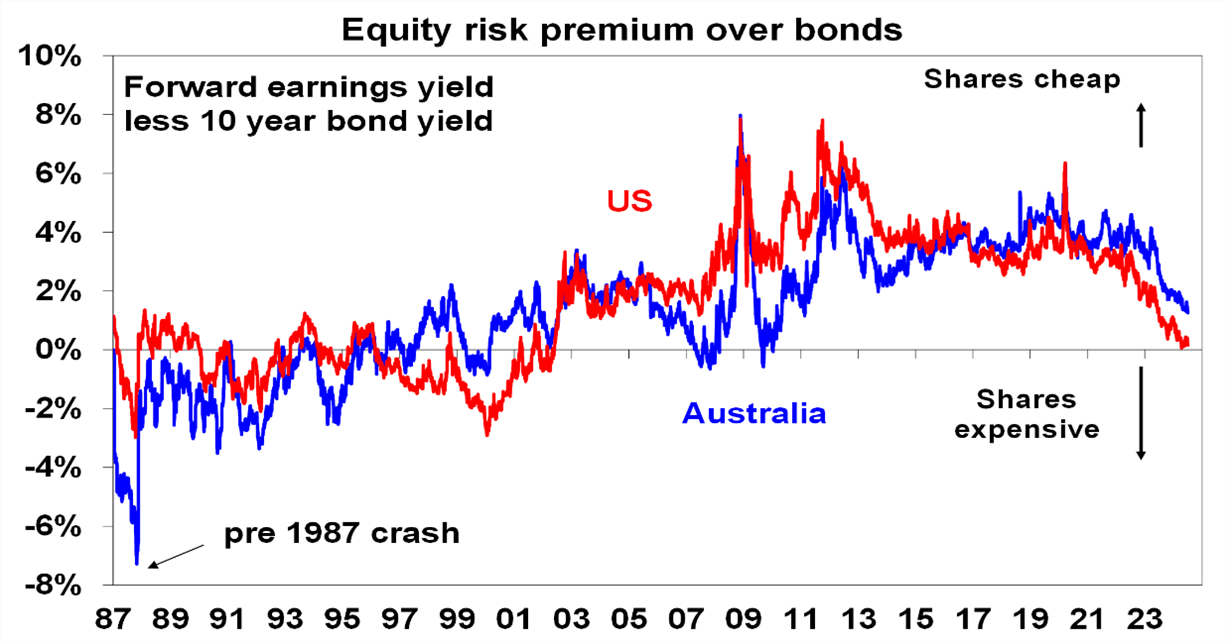 - Shares are offering a low-risk premium over bonds compared to the experience of much of the last two decades, particularly US shares.